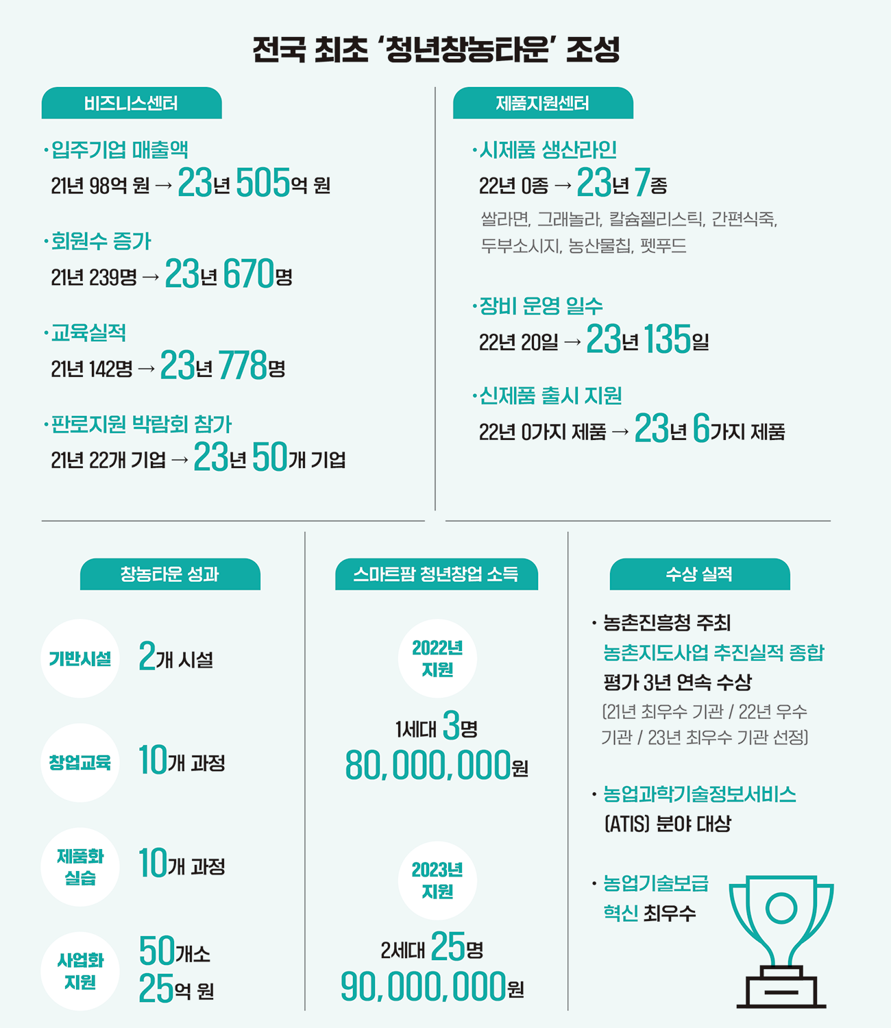 첫 단추를 잘 끼운 만큼 미래를 향한 야심 찬 비전도 설계하고 있는 청년창농타운. 전국 최초 농산업 창업 거점 전문시설을 구축했으니 이제는 전국 확산 표준모델로서 정착하는 미래를 구상 중이다. 이는 2026년까지 농산업 기업 160개를 육성하고 농산업 관련 창업생태계 구축을 목표로 한다. 농사로서가 아닌 고부가가치 산업으로 농업을 육성해 더 많은 청년이 기업인으로 자립할 수 있도록 계획하고 있다. 또한 지역 농특산물 자원을 콘텐츠화하여 지역과 청년의 동반성장을 꾸준히 키워갈 것이다.