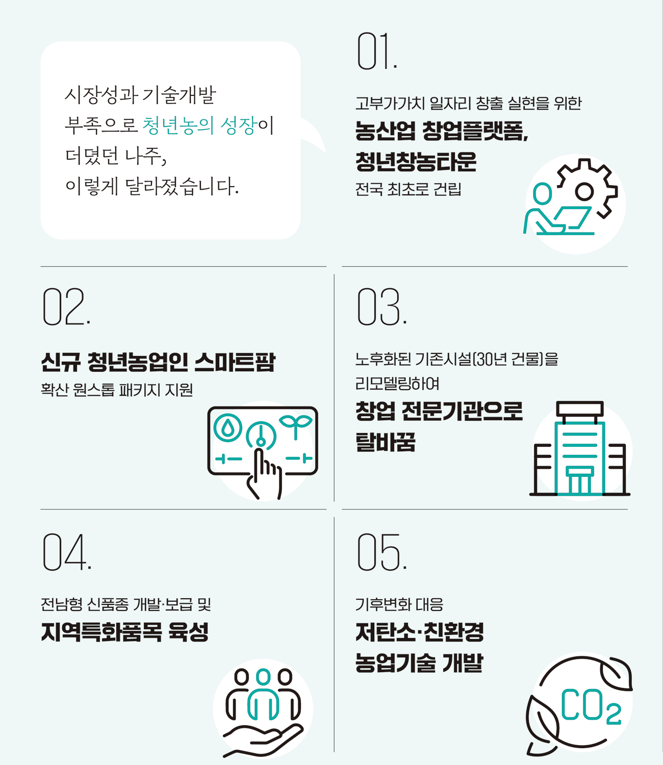 ‘청년’은 알아도 ‘창농’이란 단어는 낯설다. ‘전라남도 청년창농타운 관리 및 운영 조례’에 정의된 창농은 ‘농업의 부가가치를 높이고 일자리 창출을 위해 농업, 농촌과 연계한 산업의 창업’으로 풀이된다. 귀농과 혼재하여 사용하지만 가장 큰 차이는 ‘창업’이다. 목마른 사람이 우물을 파듯이, 불편함을 참지 않는 사람이 하는 것이 ‘창업’이다. 소극적인 사업에서 적극적인 사업으로의 전환을 꾀하며 농업인이 기업인이 되는, 미래를 반영한 굵직한 전환점이다. 농업이 부가가치를 높이는 산업으로서 역할하도록, 여러 창업의 단계를 이식시키기 위해 청년창농타운이 태어났다.