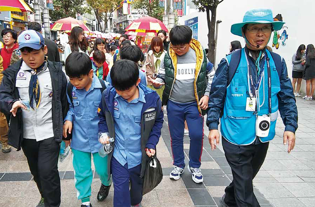 어린이들에게 원도심을 설명 중인 스토리텔러 부산시에서는 앞으로도 스토리텔러들의 복지에 신경 쓸 계획이다. 지금도 스 토리텔러들의 만족도는 높은 편이다. 고령이더라도 근무시간이 길지 않아 체력적 으로 부담이 가지 않기 때문에 건강을 지키면서 일할 수 있고, 많은 관광객들에게 삶의 터전인 부산을 널리 알릴 수 있어 큰 보람을 느낀다는 것이 장점이다.