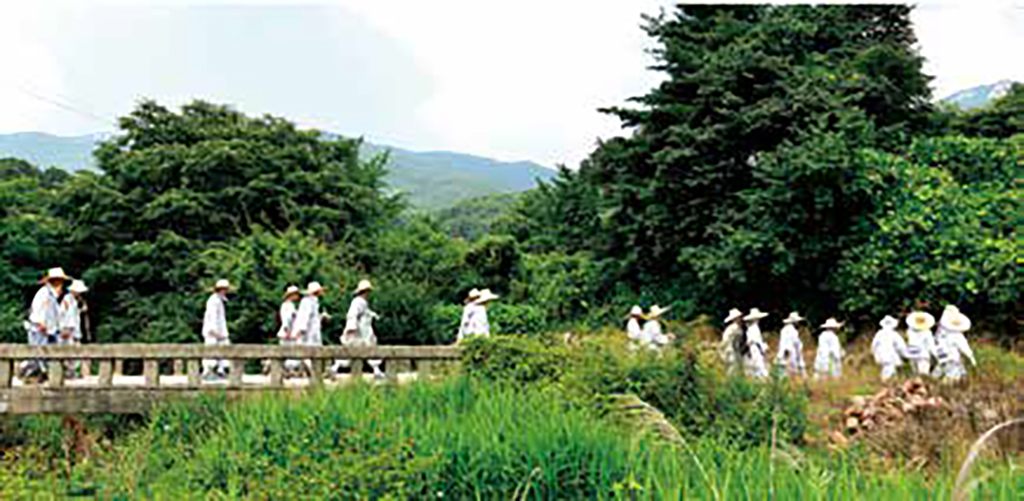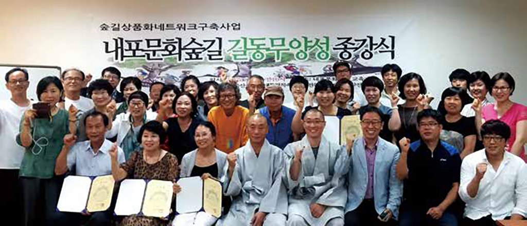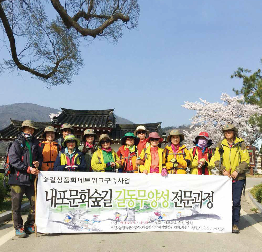 길동무 양성 종강식 이들이 개발한 프로그램 중에서 ‘숲 체험으로 풀어보는 동학이야기’, ‘백제부 흥군과 함께하는 즐거운 숲길 여행’, ‘참 나를 찾아가는 신나는 숲여행(원효암터, 가야사지)’의 4개 프로그램은 심사 과정을 거쳐 산림청의 인증을 받기도 했다. 산 림교육 프로그램 인증제는 산림의 필요성과 역할, 산림생태계의 소중함을 국민들 이 이해할 수 있도록 하는 것을 목적으로 하며, 이를 위해 프로그램 내용 등을 사 전에 검증해 질 높은 산림교육 프로그램을 제공하는 제도다. 길동무와 (사)내포문 화숲길이 함께 개발한 자체 프로그램이 이 인증을 받았다는 것은 그만큼 프로그램 의 퀄리티가 보장된다는 말이기도 하다. 내포문화숲길의 프로그램들이 산림청의 공식 인증을 받았다는 소식이 전해지자, 여러 곳에서 벤치마킹을 하기 위해 내포를 찾아오기 시작했다. 그중에서도 지리산 둘레길의 숲해설사들이 이곳을 방문한 것 은 큰 의미를 가진다. 내포문화숲길이 조성될 당시, 효율적인 유지관리를 위한 노 하우를 배우고자 지리산 둘레길에 벤치마킹을 간 경험이 있었던 것이다. 내포지역 은 지리산 둘레길에서 예산 운용과 유지·보수 매뉴얼에 대해 많은 것을 배워왔다. 그랬던 상황이 이제는 반대가 됐다. 내포문화숲길의 다양한 프로그램과 컨텐츠 운 영 방식에 대해 참고하고자 하는 단체들의 문의가 끊이질 않고 있는 것이다.