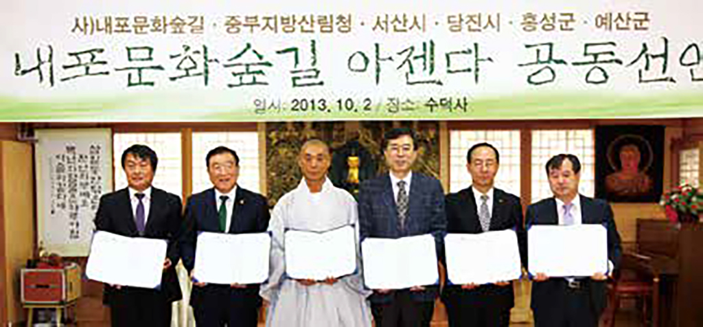 아젠다 공동 선언 내포문화숲길 조성에는 몇 가지 원칙이 있었다. 길을 새로 만드는 것을 최소화하 도록 기존의 길을 최대한 이용할 것, 생태·마을·자연에 영향을 미치지 않는 친환 경적인 길로 조성할 것, 내포지역이 지닌 역사, 문화, 생태적 가치가 길에 구현될 것, 포장도로는 최대한 배제하면서도 보행자의 안전을 보장할 것, 지역 주민들에 게 경제적 혜택이 돌아갈 것 등이 그것이다. 이렇게 다수의 원칙을 바탕으로 하는 길이다 보니, ‘어떻게 유지 관리를 하느냐’도 해결해야 할 중요 과제였다. 이에 2013 년, 4개 시군은 함께 ‘내포문화숲길 아젠다 공동선언’을 발표한다. 시군의 경계를 허물고 만들어진 길을 ‘하나의 길’로 관리·운영하는 데에 뜻을 모은 것이다.