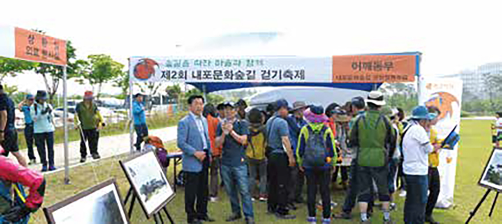 내포문화숲길 전구간 노선도 이들은 또한 내포문화숲길의 홍보대사이기도 하다. 홍보를 위해 ‘클린워킹’ 등 각종 캠페인을 벌이고 카페와 페이스북도 운영하고 있다. 1년에 두 차례씩 책자 ‘내 포문화숲길’도 발간하고 있다. 2014년 10월 창간된 이 책자는 내포문화숲길이 가지 고 있는 이야기를 소개하는 것은 물론, 내포지역의 마을 이야기, 숨겨진 비경, 길을 직접 걸은 사람들의 체험담, 길을 만든 사람들의 노고 등 ‘내포문화숲길’에 대한 전 반적인 내용을 다루고 있다. 이 소식지는 지역민들에게 내포문화숲길에 대한 정보 를 전하는 동시에, 전국의 학교, 성당, 관공서 등 여러 곳에 홍보물로 사용된다. 내 포문화숲길을 알리기 위해 축제를 열기도 한다. 내포문화숲길 걷기 축제, 청년 힐 링캠프, 상생캠프 등 이미 여러 축제가 진행된 바 있다. 특히 내포문화숲길 걷기 축 제는 작년에 이어 올해에도 개최되어 벌써 2회째를 맞고 있다. 내포문화숲길을 대 내외에 널리 홍보하고 개통된 길의 효율적인 관리·운영 방안과 활성화를 위해 각 분야 전문가들이 모여 함께 발전 방안을 모색하는 것을 취지로 하며, 올해에는 약 3천 명이 넘는 인원이 축제에 참가했다.