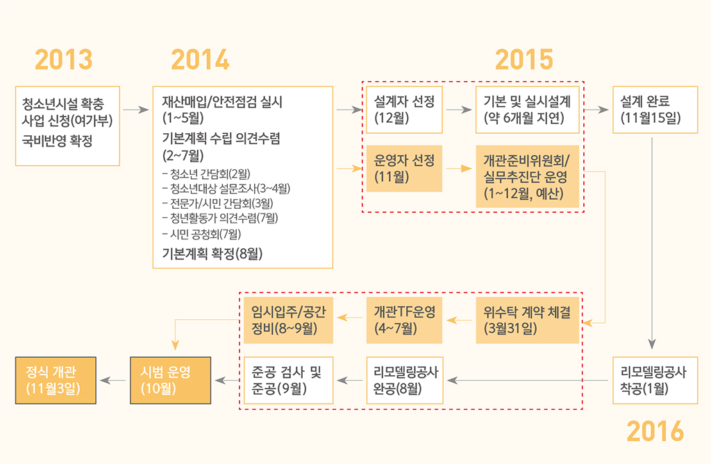 삶디의 벽면 광주시는 센터 설계와 운영에서 가장 중요한 것은 이곳의 주인인 청소년들이라는 생각을 고수해오고 있다. 2014년 안전점검실시 단 계에서부터 이미 청소년들의 의견이 반영되기 시작했으며 2월에 열린 청소년 간담회를 시작으로 3월에서 4월 동안 설문조사가 진행 되었고, 이후 전문가들과 청년활동가들의 의견과 시민 공청회를 거 쳐 8월에 기본계획이 확정되었다.