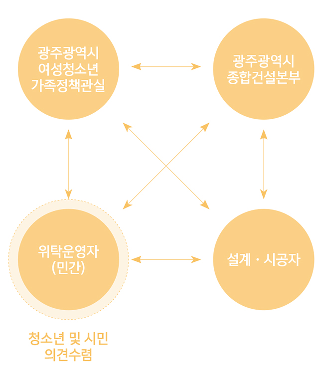 예상치 못한 복병을 만나며, 설계는 수정에 수정을 거듭해야만 했던 시기도 있었다. 설계자와 운영자가 선정된 후 2015년부터 본격적인 설계에 들어갔지만 서로의 의견을 세밀하게 조율하여 반영하려 던 시도는 6개월간이나 사업의 발목을 잡았다. 똑같은 한국말이지만, 설계자들과 청소년활동가들 사이엔 생각보다 큰 언어사용의 차이가 존재하고 있었다. 사용 하는 언어가 다르다 보니 사업의 속도도 더뎌 졌지만 상호간의 신뢰가 쌓이지 않는 것이 무엇보다 문제였다. 광주 시는 결국 둘 사이를 조정하기 위한 묘안을 생각해 냈다. 바로 청소년 활동 영역의 언어와 전문가인 설계자의 언어를 ‘통역’하는 것 이었다.