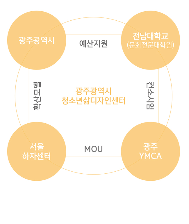 삶디자인센터에는 이렇듯 초기부터 사업을 이끌어온 ‘어른’들이 있 다. 청소년 사업 분야에서만 10년 이상 활동하고 있는 베테랑인 박 형주 센터장은 광주시 만의 개성이 살아있는 최고의 청소년 센터를 짓고자 했다. 그를 비롯하여 광주광역시 청소년활동진흥센터의 김 성훈 소장, 광주광역시 학교밖청소년지원센터의 이민철 센터장, 전 남대학교의 정경운 교수 등 많은 전문가들이 사업초기부터 센터를 보듬어왔다. 시공 완료 후 운영자를 선정하는 방식으로 진행되던 기 존 청소년 사업의 틀을 깨고, 사업초기에 운영자를 선정하는 방식으 로 진행된 것이다.