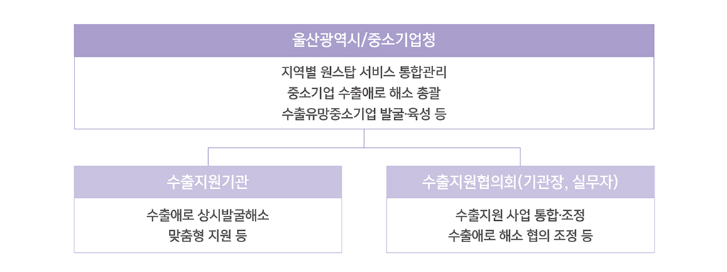 원스톱(one-stop) 지원을 위한 일원화는 하드웨어에만 국한 된 것이 아니다. 울산시는 이미 2015년부터 2억 원의 예산을 투입해 ‘울산 통상지원시스템’을 준비하고 있었다. 2016년 1월에 첫 선을 보 인 통상지원시스템은 ①FTA 등 각종 무역정보 제공 ②울산시 통 상지원시책 안내 ③통상지원시책 온라인 참여 신청 ④수출 중소 기업 정보 D/B 구축 ⑤통상지원시책 수혜 현황 관리 등 다양한 기 능을 수행한다. 정부나 무역협회 등에서 실시간으로 제공하는 세계 경제동향과 세계 경제의 리스크 요인, 통상환경 전망 등 수출과 관 련된 다양한 정보도 한눈에 볼 수 있다.