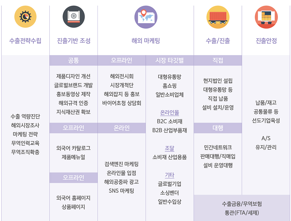 수출 희망 중소기업은 제일 첫 단계인 ‘수출 전략수립 단계’에 서 수출 역량을 진단받고 그에 맞는 국가에 대한 정보를 얻는다. 다 음으로 ‘해외진출 기반’을 다지기 위해 타깃 시장에 맞춰 제품의 디 자인 등을 어떻게 보완할지, 상품 카달로그와 홈페이지 등은 어떠 한 방식으로 제작하는 게 좋을지를 안내받는다. 셋째 단계에 이르 면 ‘해외 마케팅’을 본격적으로 펼치게 되는데, 해외 무역사절단으 로 선정된 기업은 해외전시회나 바이어초청 상담회 등에 참여하 여 자사 제품 홍보에 직접 나서게 된다. 그리고 이 단계를 통해 ‘수 출 및 해외 진출’이 확정되면, 기업은 관련 기관의 도움을 받아 ‘수 출 직접운영’과 ‘대행운영’ 중 한 가지를 선택해 제품을 납품하게 된 다. 마지막으로 ‘수출 안정화’를 위해 수출 계약 체결 후에도 지속적 인 지원 ·관리를 받는다. 울산시의 이러한 체계적 시스템 속에, 2016 년에만 일본, 중국 등 세계 24개 국 30개 도시에 89개의 중소기업이 파견되었다. 그 결과 수출 상담건수 951 건과 상담금액 4억 3천만 불을 기록했으며, 그 중 445건의 계약이 성사되어 1천 4백만 불이라 는 수출 성과를 거둘 수 있었다.