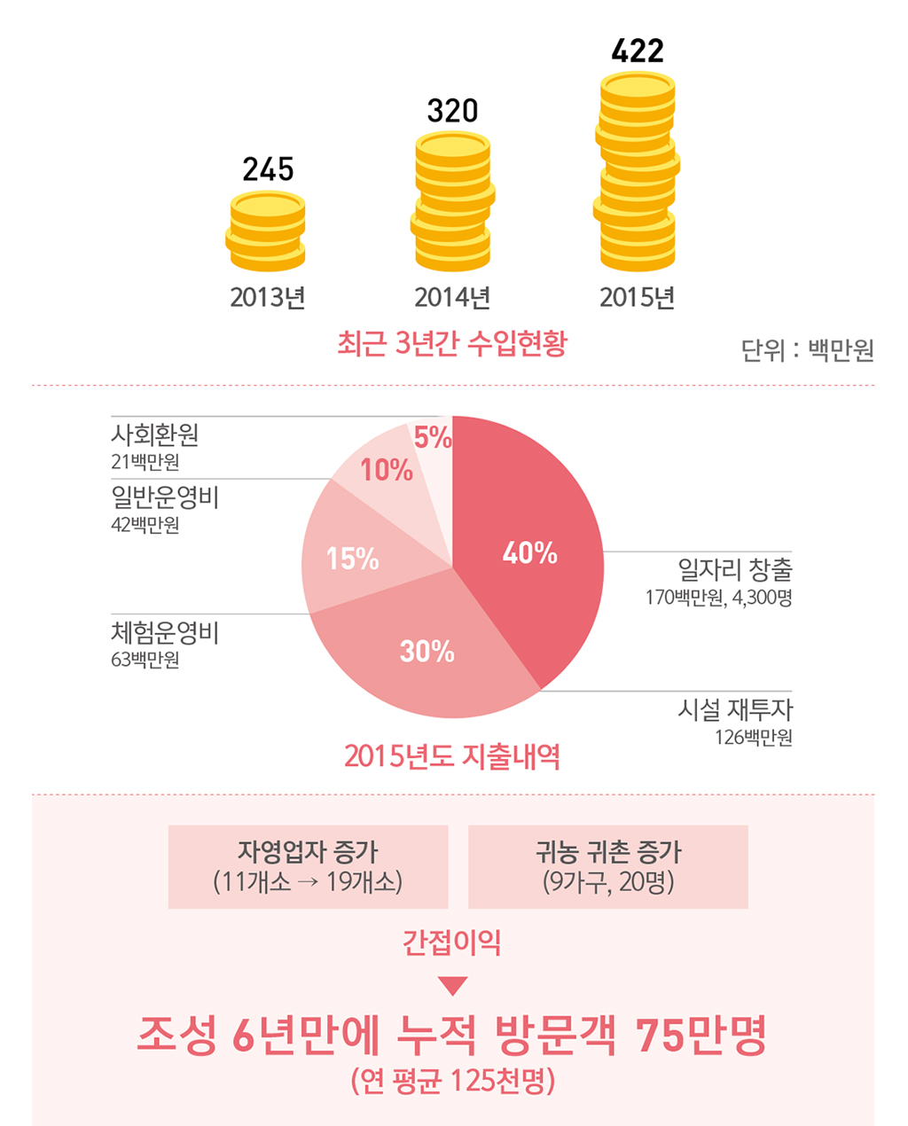 | 지역역량강화 | 주민교육, 관광프로그램 개발, 지역발전컨설팅, 홍보마케팅, 마을운영지원, 설계비, 감리비 등 | 1,249 | 641 | 457 | 151 |