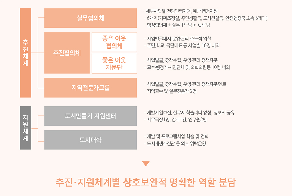 남구는 2008년부터 전국 최초로 도시활력사업 전담조직인 도시경관과(현 도시재생총괄과)를 설치해 행정 조직력을 강화시 켰다. 때문에 사업의 추진·지원 체계를 구축하는 일은 크게 어려 운 일이 아니었다. 가장 큰 난관은 지역 구성원의 합의를 이끌어 내는 일이었다.