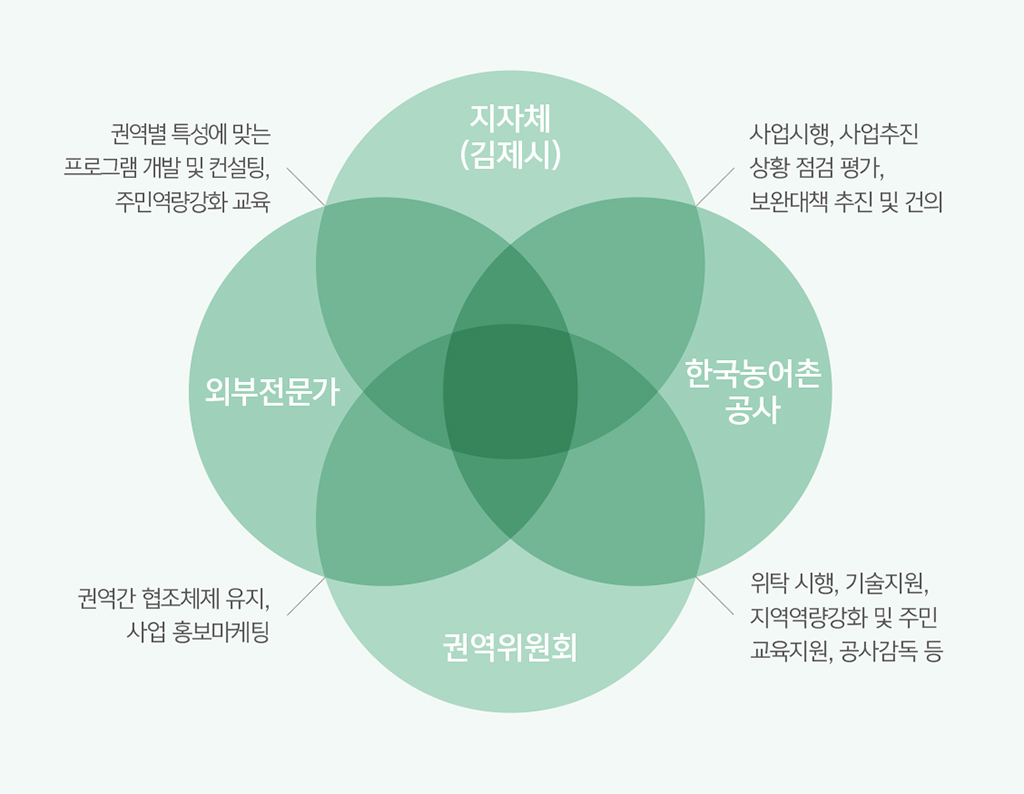 벽골제 권역의 사업주체는 크게 네 곳으로 나눌 수 있다. 전체적 으로 사업을 추진하고 점검하는 역할을 하고 있는 ‘김제시’, 위탁 시행하며 공사를 감독하고 기술을 지원하는 ‘농어촌공사’, 권역 간 협조체제를 유지하고 사업 마케팅을 담당하고 있는 ‘권역위원회’, 그리고 권역별 특성에 맞는 프로그램과 컨설팅을 담당하고 있는 ‘외부전문가’들이다. 이 중 농어촌공사는 초기 주민 교육부터 각종 시설까지 사업의 전체 과정에 관여했다. 농어촌공사의 부진국 과 장은 사업주체들이 진행과정에서 가장 중요하게 생각한 것은 ‘주 민’이었다고 말한다.