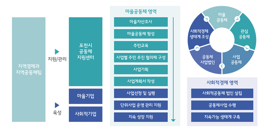 주민들을 위해 시행되는 공동체 사업이지만, 많은 지역에서 이를 목표로 한 중간지원에 어려움을 겪는 경우가 많다. 지역의 이권이 얽히면서 최초 사업의 목표가 흔들리게 되거나 민간 기관끼리의 지나친 경쟁으로 오히려 공동체 간에 균열이 발생하는 경우도 부지기수다. 이로 인해 민간이 주도하는 사업을 통해 지역사회에 깊숙이 들어가려했던 본래 취지도 와해되어, 다시 시에서 사업을 직영할 수밖에 없게 되는 경우가 발생하기도 한다. 포천시 또한 주민 참여를 통한 지역발전을 이끌기 위해 마을 만들기 사업, 마을기업 사업 등 사회적경제공동체 사업을 지속적으로 추진해 왔다. 하지만 주민참여는 예상만큼 활발하지 못했고 예산투입 대비 사업성과도 뚜렷하지 않았다.