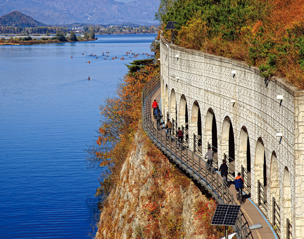 춘천시는 원래 공원으로 이용하기로 했던 인근 공간에 주차장 을 마련하고, 자전거길 이용객들이 쉴 만한 커뮤니티시설물을 조성 하기로 했다. 소양강 스카이워크 근처에는 데크를 조성하여 문화공 연을 기획하고, 주변 상가지역으로 방문객이 유입되도록 유도했다. 자전거길 이용자들을 위한 쉼터에 문인들의 이야기길과 포토존을 설치하여 볼거리와 즐길 거리를 강화하기도 했다. 사업들은 서로 연계하고 보완하며, 시너지 효과를 유발하도록 설계되었다.