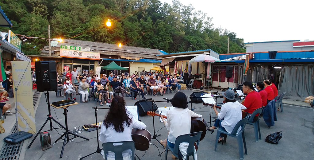 번개시장 야시장 콘서트 소양로 일대의 도시재생사업을 추진하기에 앞서 춘천시에서 기존에 추진하던 도시재생사업 방식에 대한 분석과 평가가 먼저 있었다. 2010년 춘천에서 소양·약사지구의 재정비 사업이 시작되 었는데, 그 결과 경제력 없는 원주민은 타 지역으로 밀려나고 도심 에는 고층아파트 단지만이 남았다. 지역의 특성은 사라졌고, 주민 들 간 갈등의 골은 더 깊어졌다. 지역공동체가 형성되기는커녕 그 나마 있던 공동체도 도시재생사업으로 인해 해체되는 상황이었다.