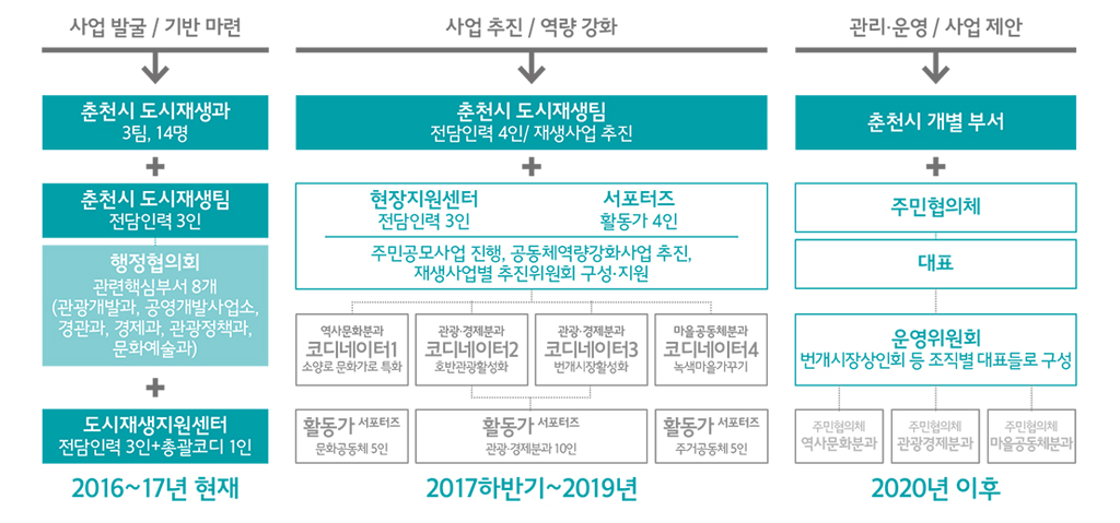 춘천시는 2014년 도시재생선도사업 신청 준비과정에서부터 도시재 생행정협의체를 구성하여 운영하고 있다. 도시재생행정협의체는 부 시장 산하 8개 과가 참여한다. 경제과, 관광정책과, 관광개발과, 문화 예술과, 경관과, 도시재생과, 공영개발사업소, 도로과가 여기에 속한 다. 현재까지는 관 주도의 도시재생을 벗어나지 못하고 있다면, 2020 년부터는 주민중심의 거버넌스로 전환하려고 계획·준비 중이다.