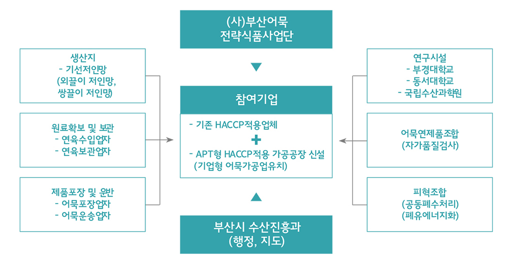 부산어묵전략식품사업단은 촘촘하게 짜인 그물처럼 서로에 게 영향을 주는 구조로 구성되어 있다. 어묵 원료를 바로 조달할수 있는 부산공동어시장과 감천 공영도매시장이 부산시 서구와 사 하구에 위치하고, 원료 확보와 보관을 위해 연육수입업자, 연육도 매업자 및 연육보관업자와 어묵가공업자가 연계되어 있다. 부경 대학교, 동서대학교와 국립수산과학원은 연구 개발을, 신평동에서 폐수처리를 담당하는 피혁 조합과 부산시도 힘을 보탰다. 부산시 는 (사)부산어묵식품전략사업단의 사업 계획서를 검토하고 대학과 연구기관이 사업단에 참여할 수 있도록 네트워킹을 형성하는 데 조력했다. 2014년, 농림축산식품부의 지역전략식품산업육성사업 에 선정된 (사)부산어묵식품전략사업단은 부산시와 사하구청의 지 원과 더불어 2014년부터 2018년까지 5년간 총 67억 원의 예산을 확보할 수 있었다.