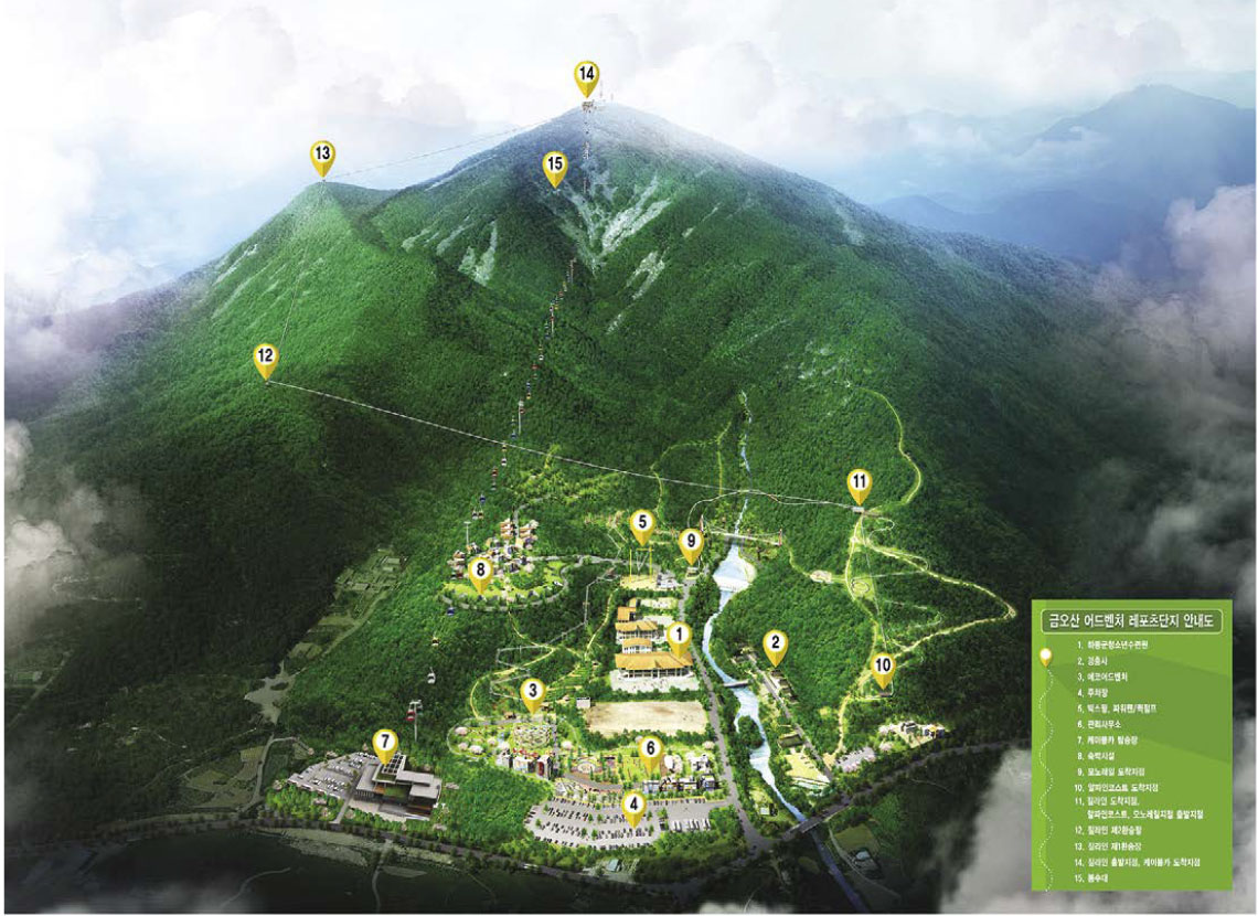 금오산 레포츠단지 조감도이번 사업으로 하동은 레포츠 단지로 발전하기 위한 기반을 쌓을 수 있었다. 향후 하동은 금오산 부근에 여러 익사이팅 시설을 갖춰, 다양한 레포츠를 즐길 수 있도록 계획하고 있다. 이미 해양레저 시설을 설치하는 ‘어촌뉴딜 300 사업’, 금오산 정상까지 탐방할 수 있는 ‘금오산 하늘길 조성사업’이 연계 사업으로 진행 중에 있다. 케이블카 설치 사업 또한 진행될 예정이다. 현재는 케이블카가 없어 매표소에서 출발부까지 차량으로 탑승객을 운송해야 하는 번거로움이 있다. 케이블카가 설치되면 이를 해소하는 것은 물론, 탑승객도 더욱 늘어날 것으로 보고 있다. 이외에도 금오산 스카이워크 설치사업, 알파인코스터 설치사업 등을 구상 중에 있다.