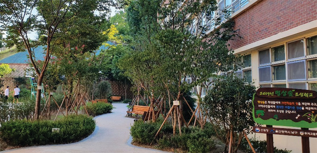 무거고등학교 명상숲 건물과 건물 사이, 휑한 공간에 이팝나무 등 다양한 나무 1,523그루가 심겼다. 이제 새소리도 들리고 바람에 나뭇잎도 흔들린다. 산림청은 무거고등학교를 2019 명상숲 우수사례로 꼽았다