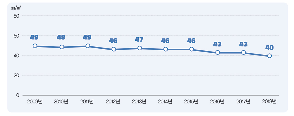 자연은 도시를 치유하지만 그것은 사람이 얼마나 제대로 이해하고 보살피는 지에 따라 얻을 수 있는 결과 : 미세먼지오염도1995년 69㎍/㎥→ 2018년 기준 40㎍/㎥