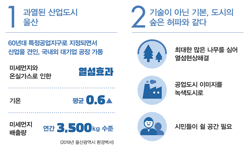 도시의 명암도 있었다. 사방이 회사와 공장들로 가득 차며 대기질이 악화된 것이다. 2019년 발간된 울산광역시 환경백서에 따르면 2000년대 들어 10년 동안 울산의 연평균 기온은 13.4도로 우리나라 평균 기온보다 0.6도 높았으며 열대야 일수와 폭염 일수도 우리나라 평균(3.7일, 10.2일)보다 각각 0.3일과 1.6일이 더 많았다. 지리적 특성도 있지만 미세먼지와 온실가스로 인한 열섬효과를 무시할 수는 없었다. 2012년 기준 울산의 미세먼지 배출량은 서울의 두 배를 넘는 연간 3,500kg 수준이었기 때문이다. 심장이 빠르게 뛸수록 도시는 숨 막혔고 새로운 허파가 필요했다. 문제해결을 위해 울산광역시가 집중한 것은 또 다른 기술이 아닌 기본이었다. 최대한 많은 나무를 심어 도시를 숨 쉬게 하자는 것이다.