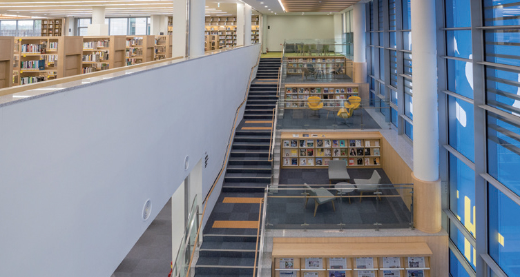커뮤니티 스텝 1층부터 3층까지 연결하는 계단, 커뮤니티 스텝은 도서관에서 전망이 가장 뛰어난 곳으로 손꼽힌다. 이곳에서 신문과 연속간행물을 보며 쉴 수 있다.