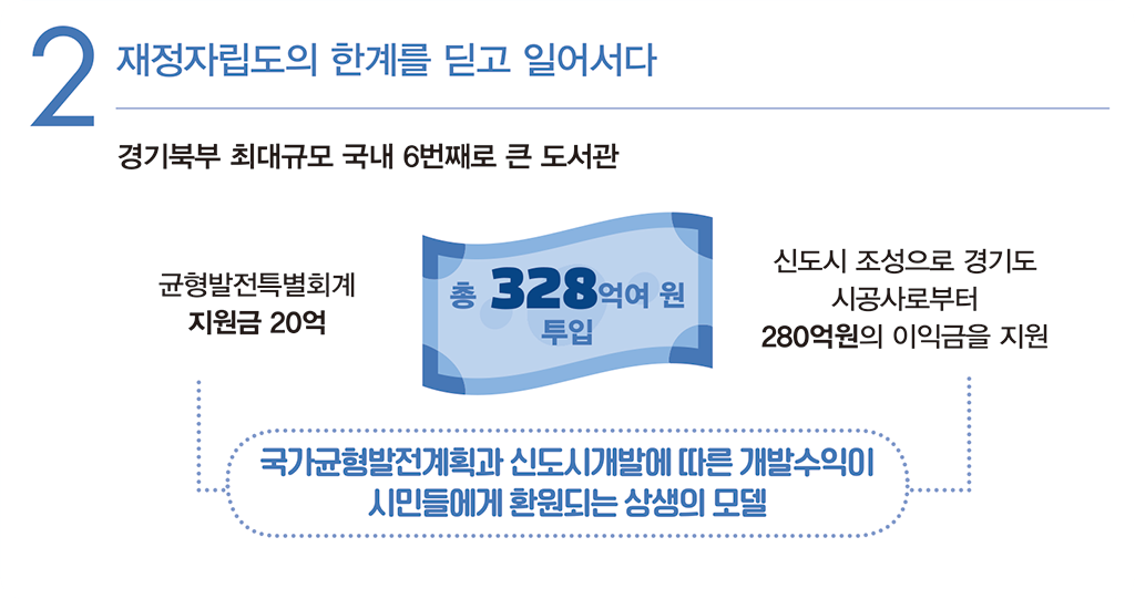 사업 추진에 가장 큰 동력이 된 것은 균형발전특별회계 지원금 20억이었다. 이 지원금은 시드 머니(Seed Money)가 되어 외부 재원을 확보하는 데 견인 역할을 해 주었다. 여기에 다산 신도시 조성으로 경기도시공사로부터 280억 원의 이익금을 지원받을 수 있었다. 국가 균형발전 계획과 신도시 개발에 따른 개발 수익이 도서관 건립으로 시민들에게 환원되는 상생 모델이 만들어진 것이다.