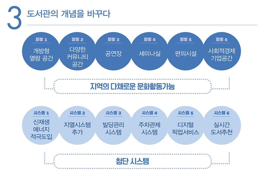 운영 면에서도 남다른 전략을 구사하고 있다. 효율적 운영과 이용자의 자유로운 접근을 위해 빌딩관리시스템과 주차관제시스템을 도입하였고, 통합시스템 구축을 비롯하여 예약 후 도서를 바로 찾아갈 수 있는 디지털픽업서비스, 빅데이터를 활용한 실시간 도서추천 서비스까지 스마트한 운영방식을 도입하고 있다. 안타깝게도 현장 방문 당시 도서관은 코로나19 확산 방지를 위해 휴관 및 제한 운영 중에 있었으나 개관 이후 약 1주일이라는 짧은 운영기간 동안 하루 수천 명에 이르는 이용자가 방문할 정도로 시민들에게 높은 호응을 얻었다고 한다. 전국 자치단체의 문의와 벤치마킹이 줄을 잇고 있음은 물론이다. 사서직 직원 3명을 따로 두고 도서관 도슨트 투어를 진행하고 있을 정도라니 그 인기를 가늠해볼 수 있다