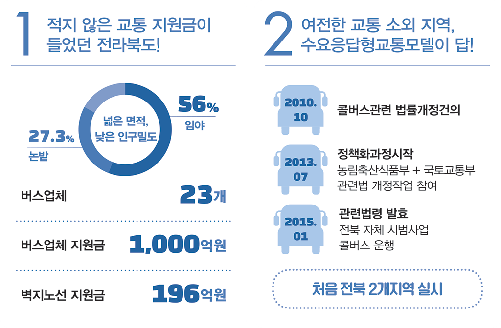 면적은 넓은데 인구밀도는 낮은 전라북도의 고민 중 하나는 대중교통 서비스의 문제였다. 현재 전라북도에서 운행 중인 버스업체는 모두 23개이다. 14개의 시·군에 전라북도를 포함한 도 내 15개 행정기관이 이 23개 버스업체에 지원하는 금액만 연간 1,000억 원에 달한다. 그 중 벽지노선에 대한 지원금은 연간 196억 원이다. 이마저도 해마다 증가하고 있는 추세이다.