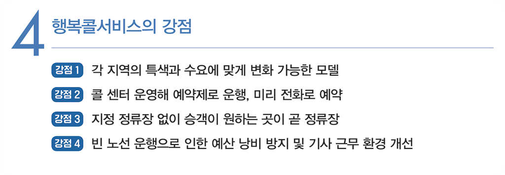 차이가 없는 것은 요금만이 아니다. 수요응답형교통(DRT)모델 안에서는 택시도 운행하는 지역에 제한을 두어 버스처럼 일정한 범위 내에서만 운행할 수 있다. 대중교통의 범주에 속하지 않았던 택시가 대중교통으로 기능할 수 있도록 몇 가지 제한을 둔 셈이다. 이름하여 행복콜버스의 자매품 행복콜택시의 탄생이다.