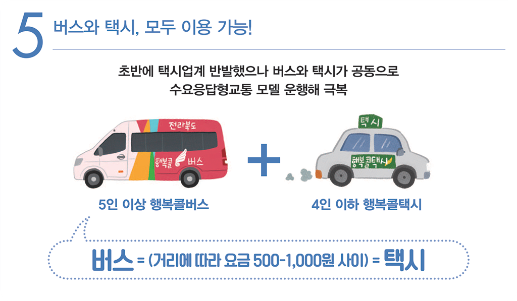 초반에 택시업계 반발했으나 버스와 택시가 공동으로 수요응답형교통모델 운행해 극복