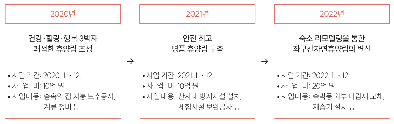 사업 첫해인 2020년에는 총 10억 원의 사업비로 숲속의 집 지붕 보수공사, 별무리하우스 벽지·장판 교체, 바람소리길 흙막이 설치, 자작나무숲 산책로 및 계류 정비 등을 완료했다. 2021년에는 첫해와 마찬가지로 10억 원의 사업비를 투입해 총 4개 분야 용역 및 공사를 추진했다.