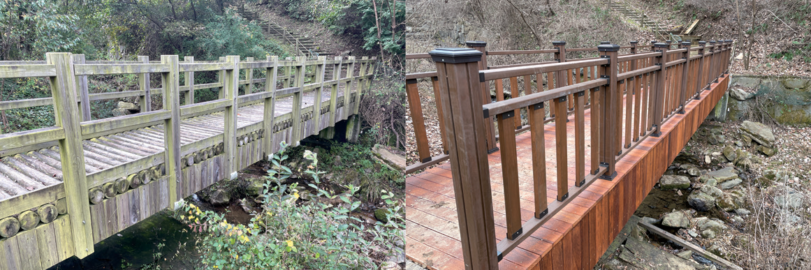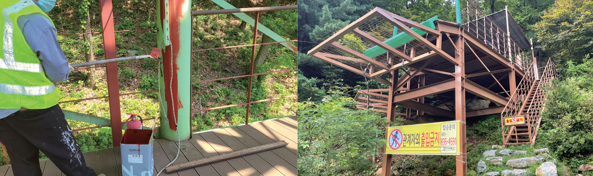 첫 번째, 2021년 1월부터 6월까지 6개월간 진행된 천문대와 집라인 타워 보완공사는 156백만 원이 투입됐다. 집라인 타워 녹슮 방지 처리, 시설물 도색 작업 등 노후된 체험시설을 보수하여 깨끗하게 정비했다. 특히 집라인 타워는 기존 녹색 계열에서 목재 색으로 새롭게 도장해 휴양림과 어울리는 숲속의 나무 이미지를 선보였다.