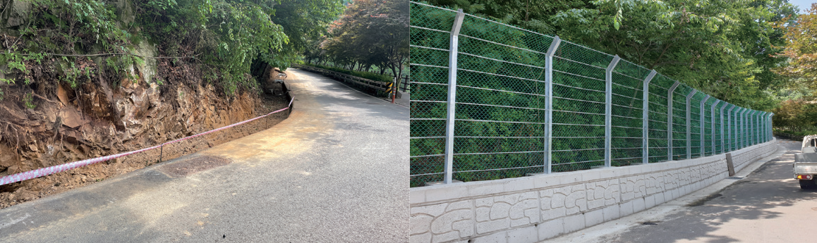 세 번째, 낙석방지시설 설치공사는 295백만 원의 사업비로 2021년 2월부터 6월까지 5개월간 진행됐다. 휴양림 내 황토방으로 올라가는 길과 바람소리길 등 사면부에 낙석방지시설을 설치하여 지나가는 차량과 이용객들의 안전 확보에 크게 기여했다.