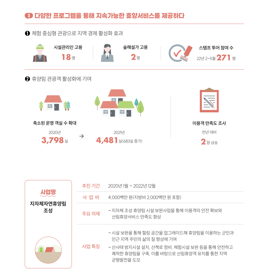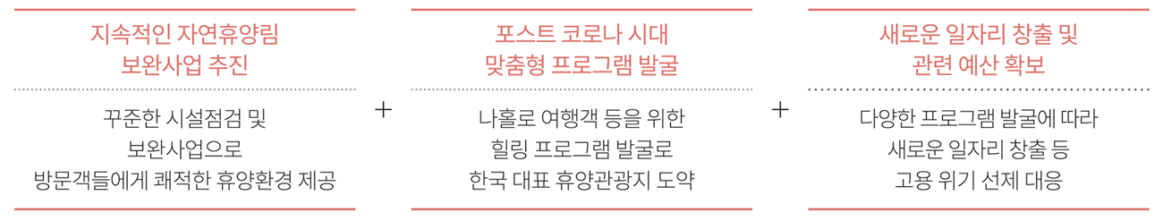 이번 사업에서는 세 가지 성과의 지속가능성을 내비쳤다. 첫째, 지속적인 시설점검과 보완사업 추진으로 바쁜 일상 때문에, 심신의 안정이 필요한 방문객들을 대상으로 안전하고 편안한 휴식공간을 제공한다. 둘째, 코로나19가 촉발한 미래 트렌드에 발맞춰 ‘나홀로’여행객과 소규모 가족 단위의 여행객을 위한 시설별 힐링·치유 프로그램 등을 발굴하여 대한민국을 대표하는 휴양관광지로 도약한다. 마지막으로 관광, 휴식, 치유, 교육, 복지를 하나로 융합하는 다양한 프로그램을 발굴함에 따라 이에 맞는 새로운 일자리를 창출하여 지역경제 활성화와 더불어 고용 위기에 선제 대응한다.