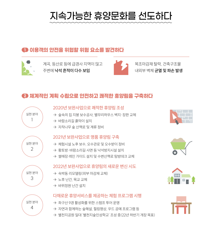이번 시설 보완사업의 주목적은 각종 재난재해로부터 이용객의 안전을 도모하고, 쾌적한 휴양환경을 조성하는 것이었다. 본 사업은 2020년부터 2022년까지 3년간 총사업비 40억 원을 투입해 연차별 계획에 따라 단계별로 진행됐다.
