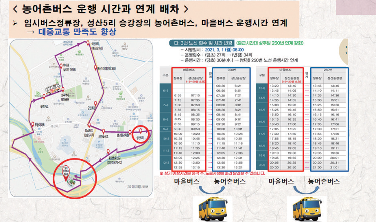하지만 정주 여건 개선을 위한 성주군의 노력은 여기서 그치지 않는다. 국비 예산을 활용해 버스를 추가로 구입하고, 주민들의 노선 요구가 꾸준하게 높은 지역을 바탕으로 노선을 확대할 예정이다. 또한 성주읍 외곽 지역을 순회하는 노선도 추가로 신설하여, 대중교통 체계를 전면 개편하고자 한다.
