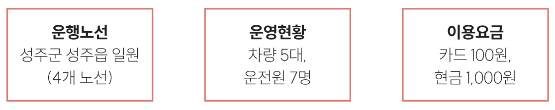 성주군의 마을버스는 지자체가 직영으로 운행한다. 마을버스 운전기사는 시간선택임기제 공무원들로 구성되어 있어, 사명감이 투철하다. 주민들의 의견을 보다 가까운 곳에서 경청하며 현재 발생하는 문제점을 발굴하고 개선하기 위해 앞장서고 있다.