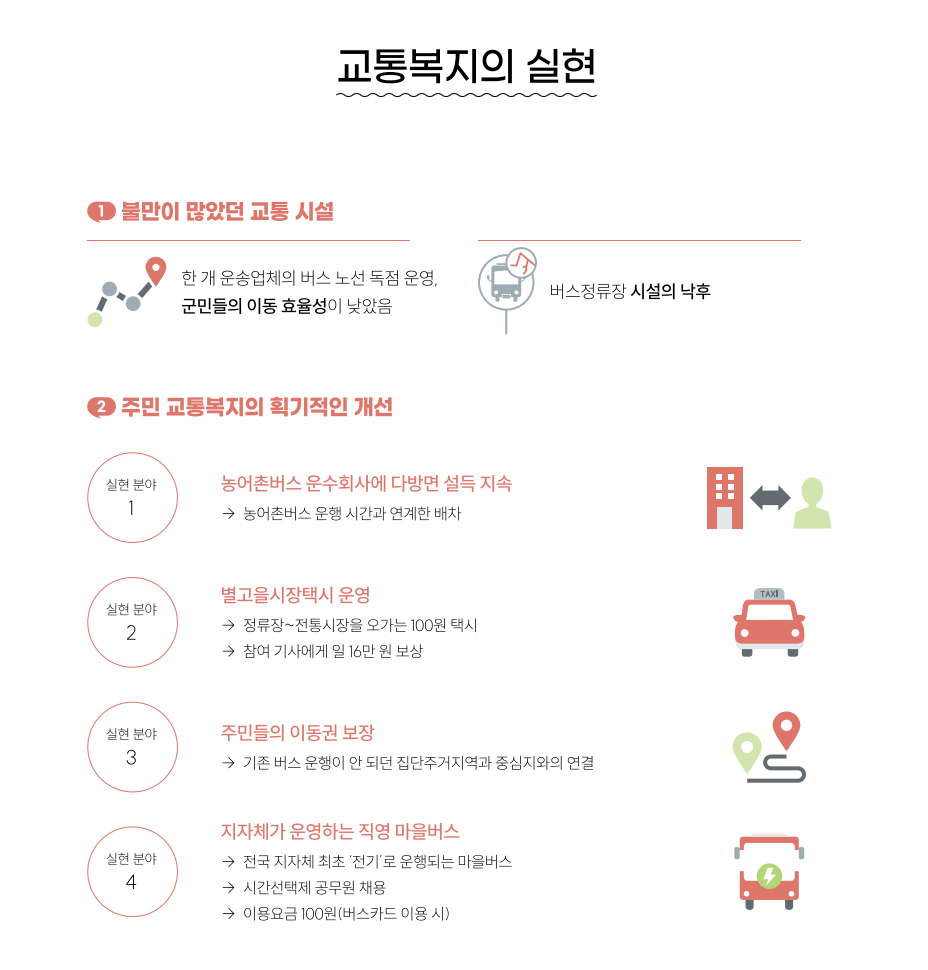 전기 마을버스 운영을 2년간 위탁한다는 마을버스 시범사업 제안, 주민 불편 사항에 대한 지속적인 논의 끝에 운수회사는 사업을 포기하였고 전국 최초 지자체 직영 전기 마을버스가 탄생됐다. 운수회사가 운영하는 농어촌버스와 전기 마을버스의 운행 시간을 서로 연계하여 배치하는 등 갈등을 해소하기 위해 다양한 방법을 모색해내기도 했다.