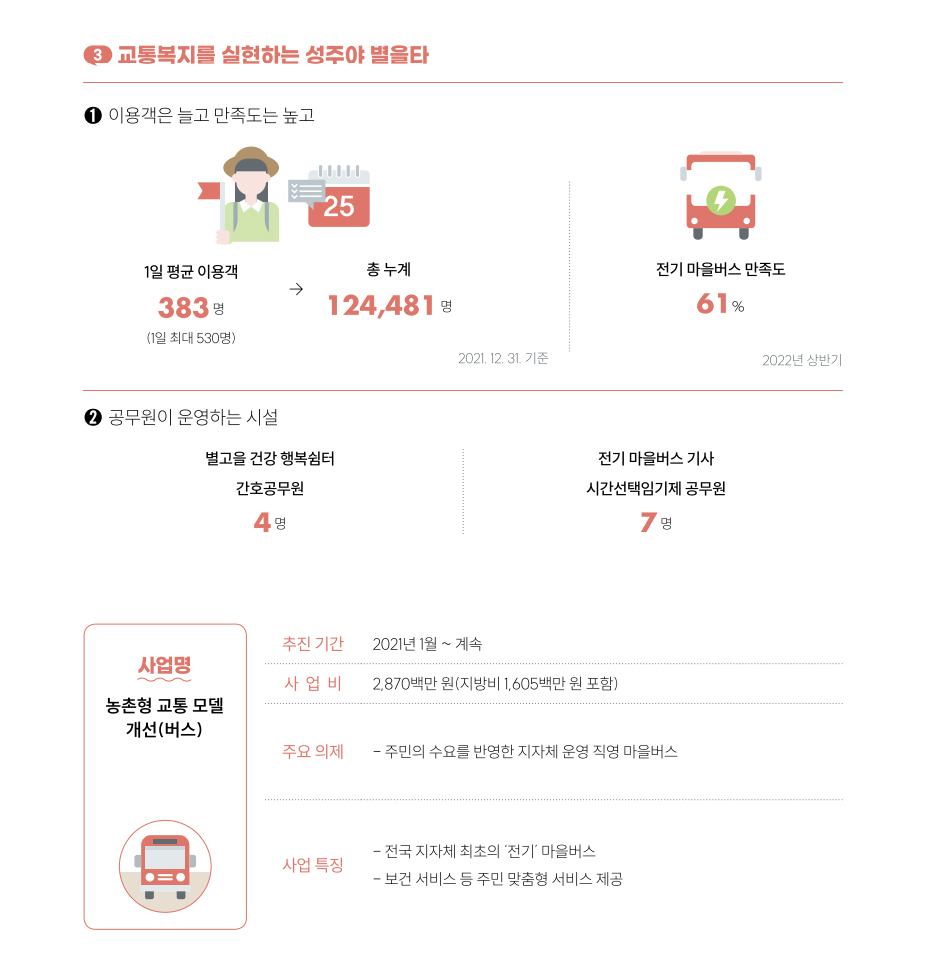 성주야 별을타는 기존에 가지 못했던 좁은 골목길을 구석구석까지 누빈다. 그러다 보니 주민들의 편의는 더욱 높아졌고 이는 만족도 우수라는 결과 지표에서도 확인할 수 있다.