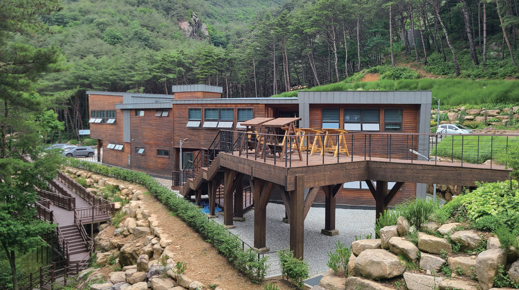 “산림휴양시설인 만큼 ‘자연휴양림’과 ‘치유의숲’은 꼭 들어가야 한다고 생각했습니다. ‘자연휴양림’은 일종의 숙박시설이라고 볼 수 있습니다. 당일치기 여행에 아쉬움을 느끼는 분들을 위해 조성한 곳으로 산림휴양관(1동/10실), 숲속의집(8동), 관리사무소 등으로 이뤄져 있습니다. ‘치유의숲’은 이름 그대로 숲에 직접 들어가 치유와 힐링을 느끼고 올 수 있도록 만든 프로그램입니다. 특히 ‘무장애 데크로드’로 장애인과 비장애인, 그리고 노약자 모두가 높은 접근성으로 어려움 없이 이용할 수 있도록 했습니다.”