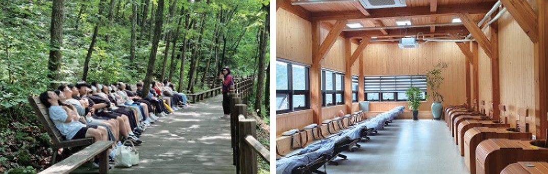 “자연을 그대로 옮겨놓은 것 같은 자연친화적인 숲속놀이터와 자연물관찰하기, 생태놀이, 야생화관찰 등 청소년과 어린이를 위한 맞춤형 숲해설 프로그램을 운영하고 있는 것도 자랑할 점입니다. 2022년 6월 기준으로 2만여 명의 어린이들이 숲속놀이터를 다녀갔고, 26회(회당 2~30명) 이상 청소년·어린이들이 숲체험 프로그램에 참여했어요. 교육지원청 관계자나 관내 초중고 교사들도 산림치유센터에서 관련 세미나를 실시하고 산림치유 프로그램에 참여하는 등 교육도시의 면모를 유감없이 발휘하고 있죠.”