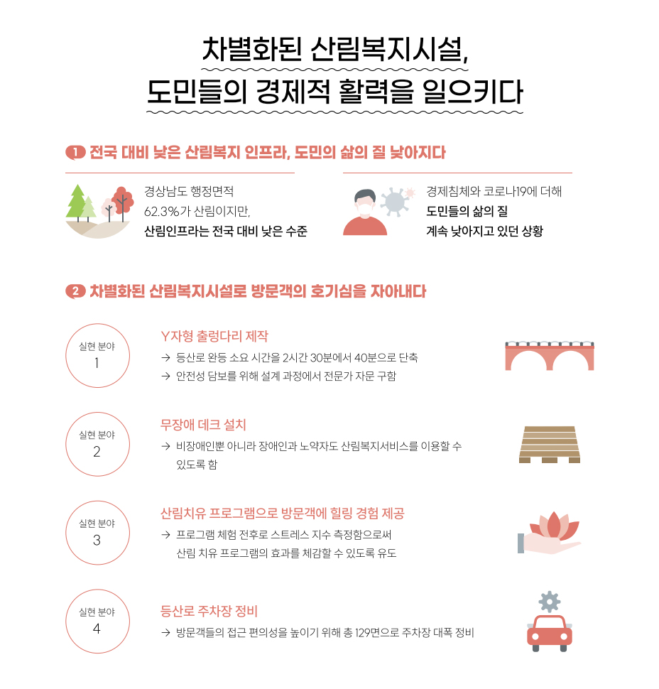 국민소득ㆍ여가시간의 증대와 산림휴양ㆍ교육ㆍ치유ㆍ체험 수요가 늘어남에 따라 산림을 기반으로 하는 행복 증진과 다양한 산림복지 정책 추진을 위해 “경상남도 산림복지진흥계획(2020~2024년” 수립 시행하고 있습니다. 주요 내용으로는 누구나 숲을 통해 건강하고 풍요로운 삶을 누리는 휴양시설을 위해 산림복지 기본선 충족, 일상 속 산림복지 실현, 맞춤형 서비스 제공, 일자리 창출, 협력적 네트워크 구축 등 5개 목표와 7대 전략 15개 이행과제를 설정하여 추진하고 있습니다.