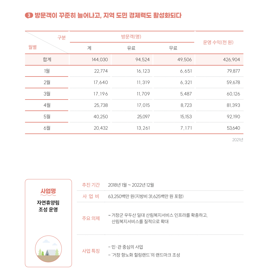 한편, 생활권에서는 도심에서 지친 도시민에게 저녁 있는 삶과 누구나 찾고 즐길 수 있는 쉼터가 되어주는 공간으로 제공하고, 산촌지역은 체류형 외부 방문객 유입을 통한 지역내 소비촉진과 산림관광 거점으로 자리 매김하여 지역경제 활성화를 통한 균형발전에 기여하도록 노력하고 있습니다.