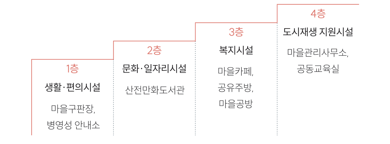 2021년 12월, 기존 도시재생뉴딜사업 현장지원센터가 있던 자리에 새 마을커뮤니티센터 ‘산전마루’가 완공되었다. 연면적 1,268.92m2의 지상 4층 규모 건물은 주민들의 교류와 문화 활동의 거점시설로서 마을에 활기를 더하고 있다. 1층에는 마을구판장 및 병영성 안내소, 2층은 산전만화도서관, 3층은 산전마루카페 및 공유공방, 4층은 강당 및 사무국으로 구성하였다. 특히 산전만화도서관은 약 8천 권의 방대한 만화 도서를 보유한 울산 최초의 만화 특성화 도서관으로, 개관 후 9천 명에 육박하는 방문객(22년 4월 기준 8,903명)이 다녀가며 새로운 지역 명소로 부상하고 있다.