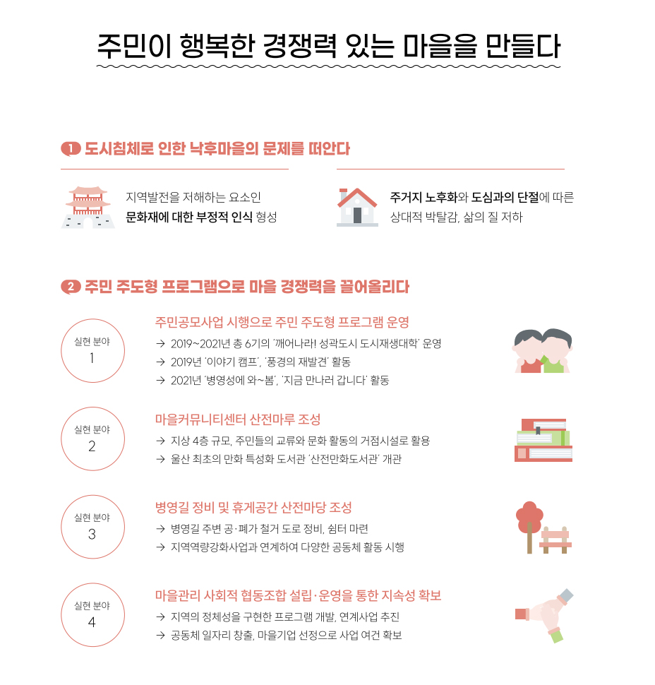 즉, 사업을 잘 마무리할 수 있었던 건 울산시와 기초자치단체, 유관기관 그리고 지역 주민들이 협심하여 열심히 노력해온 덕분이다. ‘우리동네 살리기’를 목표로 말 그대로 우리동네를 꼭 한번 살려보자는 깊은 뜻이 한데 모여 이뤄낸 결과가 아닐까. 사업 진행 과정에서 주민협의체 참여 대상을 주변 마을까지 확대하고, 주민들과 소통을 거듭하며 마을에 대한 주민들의 부정적 인식을 긍정적으로 바꿔나간 변화 과정에서 진솔함이 엿보인다.