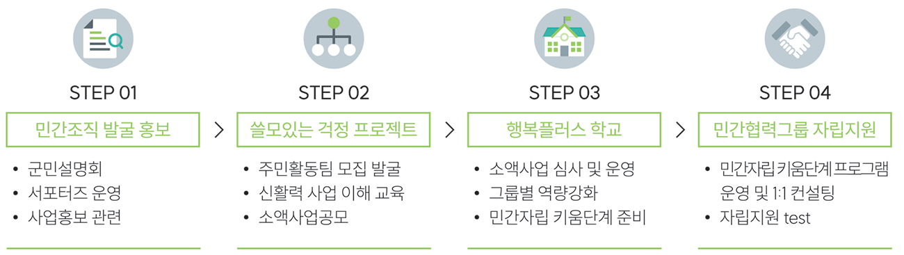 3단계: 2단계에서 팀빌딩된 주민활동팀을 대상으로 다양한 역량을 높이는 교육커리큘럼으로‘행복플러스학교’를 운영하였다. 필수교육 커리큘럼 참여를 통한 주민활동팀별 공정성 확보와 평가를 통해 주민활동팀별 소액실천사업을 진행할 수 있도록 소액사업을 지원했다.