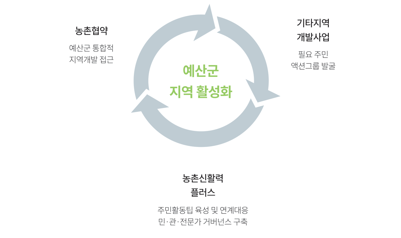 예산군 농촌신활력플러스사업은 주민조직과 함께 예산형 착한발전모델 만들기라는 목적으로 혁신적인 주민조직을 발굴ㆍ육성하여 지역개발사업 참여를 통한 일자리 창출과 지역 활성화에 기여하고자 시작되었습니다.
