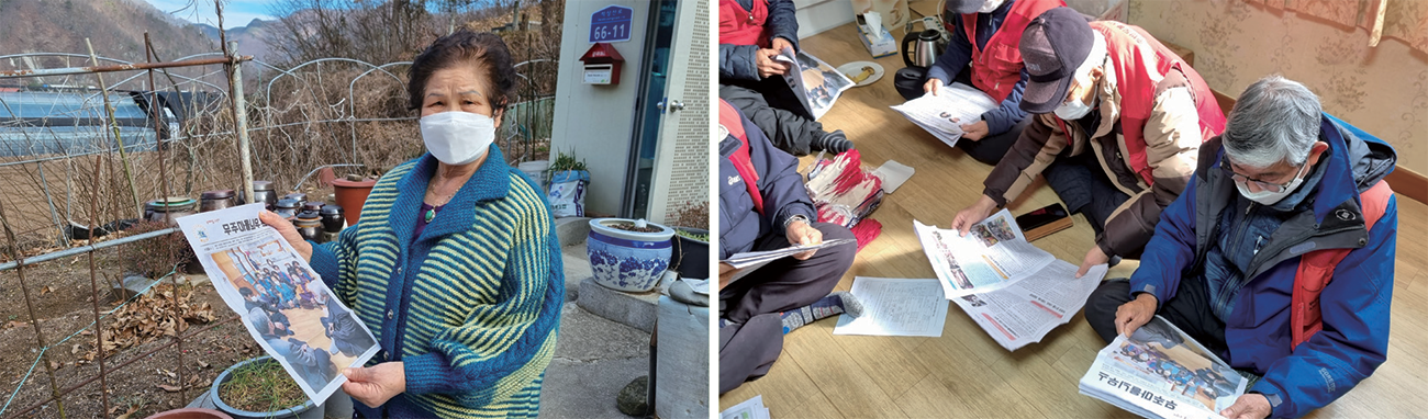 직접 받아볼 수 있는 종이신문은 매월 4천 부씩 발간해 군내 261개 마을에 배부하는데, 무주군농어촌종합지원센터 전 직원이 직접 정기적으로 마을을 방문하여 배부한다. 직접 방문하면서 마을 어르신들에게 안부를 묻기도 하고, 담소를 나누며 화합과 교류를 늘리는 것.