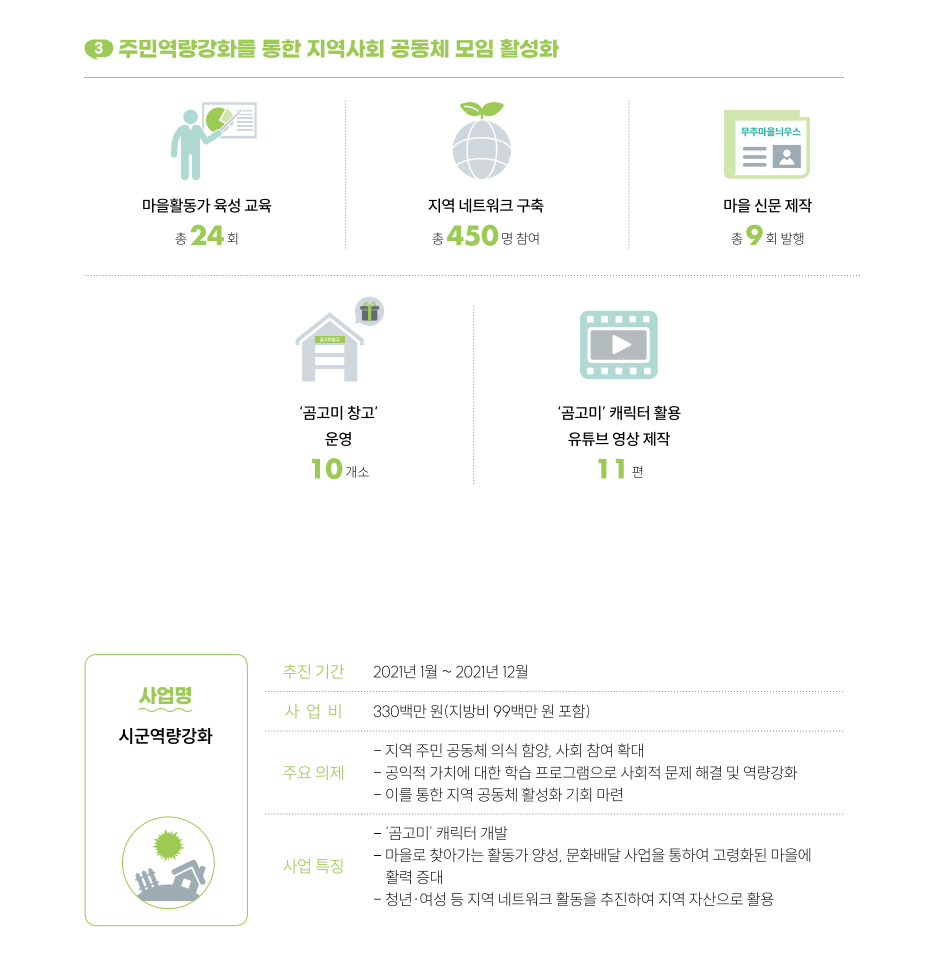무주군의 공동체 함양 및 역량강화 사업으로는 마을활동가 육성교육, 마을만들기 역량강화, 문화배달부 등 지역 인적자원 육성을 위한 프로그램을 운영하였고, 마을의 유·무형 자원조사를 통한 마을 발전방안 모색 및 주민 주도형 공동체 활동그룹 형성하고자 마을자원 진단조사와 마을신문(무주마을늬우스) 제작 사업등을 추진하였습니다.