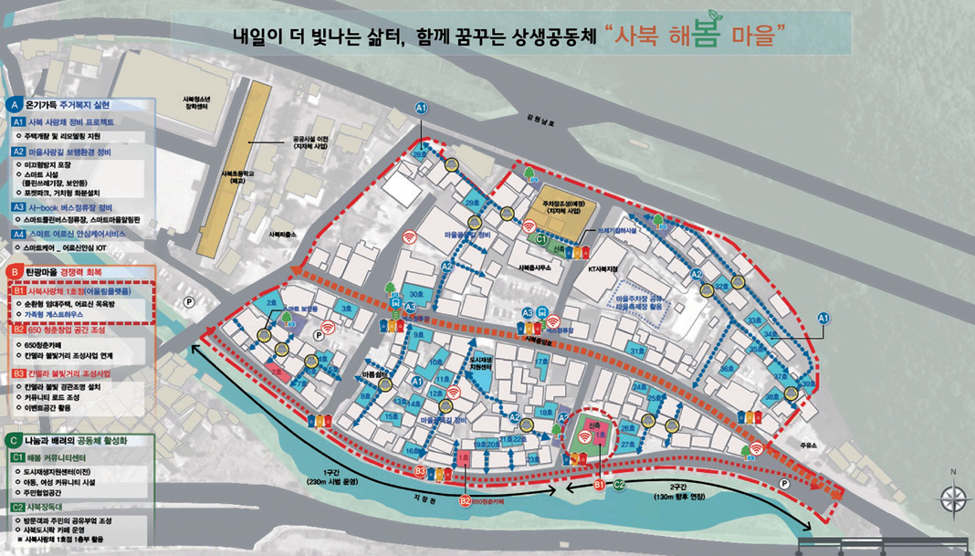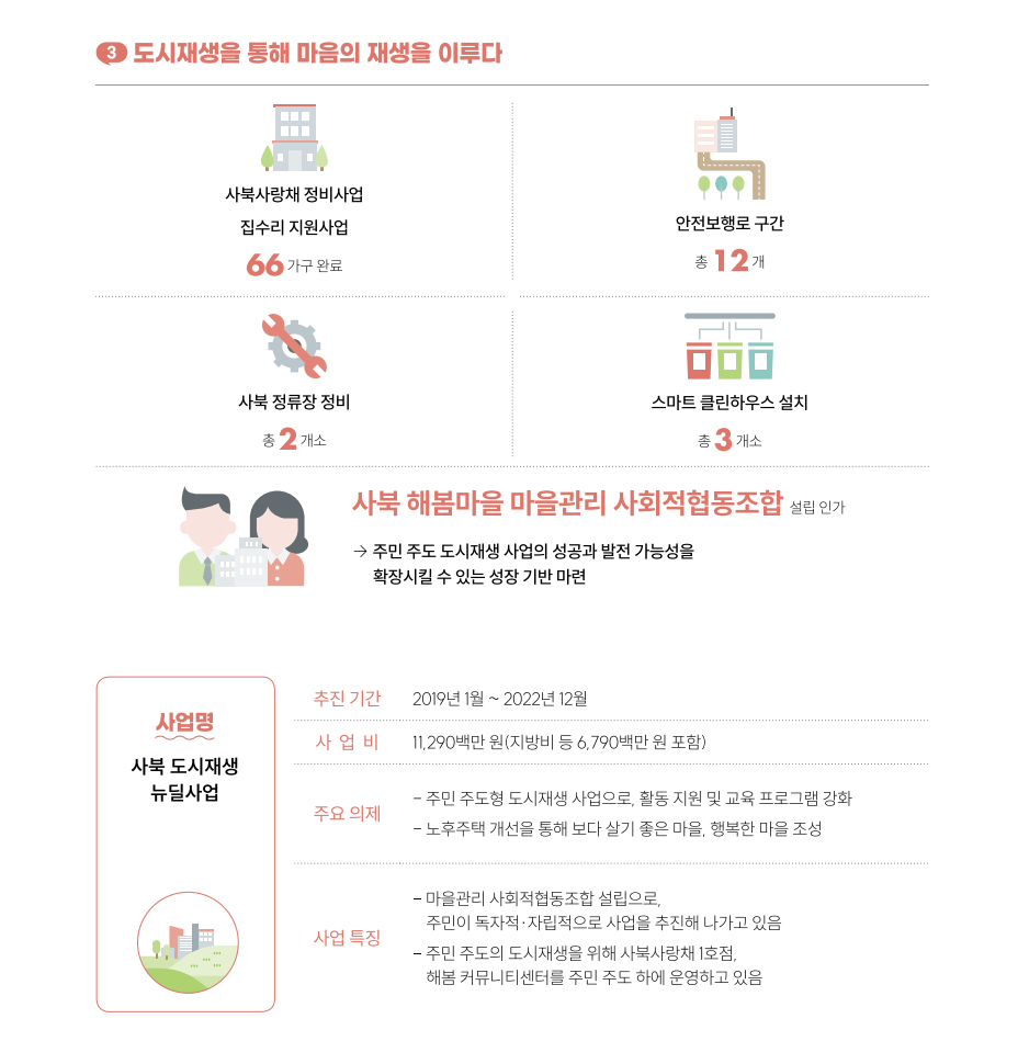 사북사랑채 프로젝트, 마을 보행환경 정비, 포켓 공원 및 사-book 버스정류장 조성, 스마트 어르신 안심케어 서비스 실행 등 주거복지를 실현하기 위한 사업이 바로 그것이다.