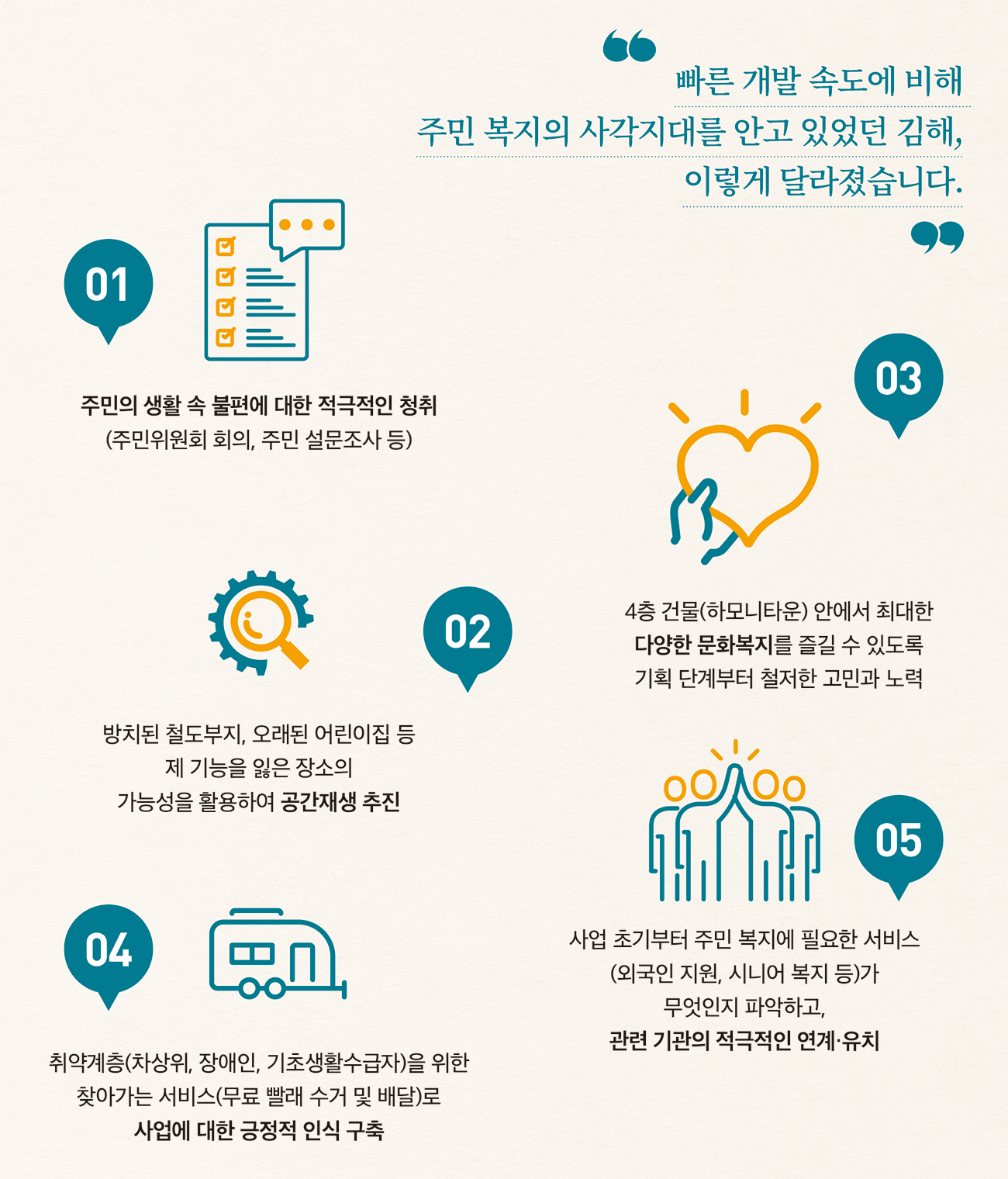 이러한 상황에서 김해시는 발 빠르게 주민의 의견에 귀를 기울여 청사진을 그려나갔다. 택지개발사업을 거치며 새로이 형성된 신도심과 기존 원도심 간에 인프라 격차가 나타날 수밖에 없는 현실에서 지역주민이 서로 잡음 없이 ‘하모니’를 이룰 수 있도록 화합의 장을 마련하고자 했다. 문화생활과 일상 속 복지를 동시에 실현하는 거점 공간을 지음으로써 한곳에 머무르며 쌓는 공동체의 정을 구현하는 것이 목표였다. 또한 폐쇄된 철도부지의 쓰임을 개척해 마음 편히 왕래할 수 있는 소통의 통로로 재탄생시키기 위해 전력을 기울였다.